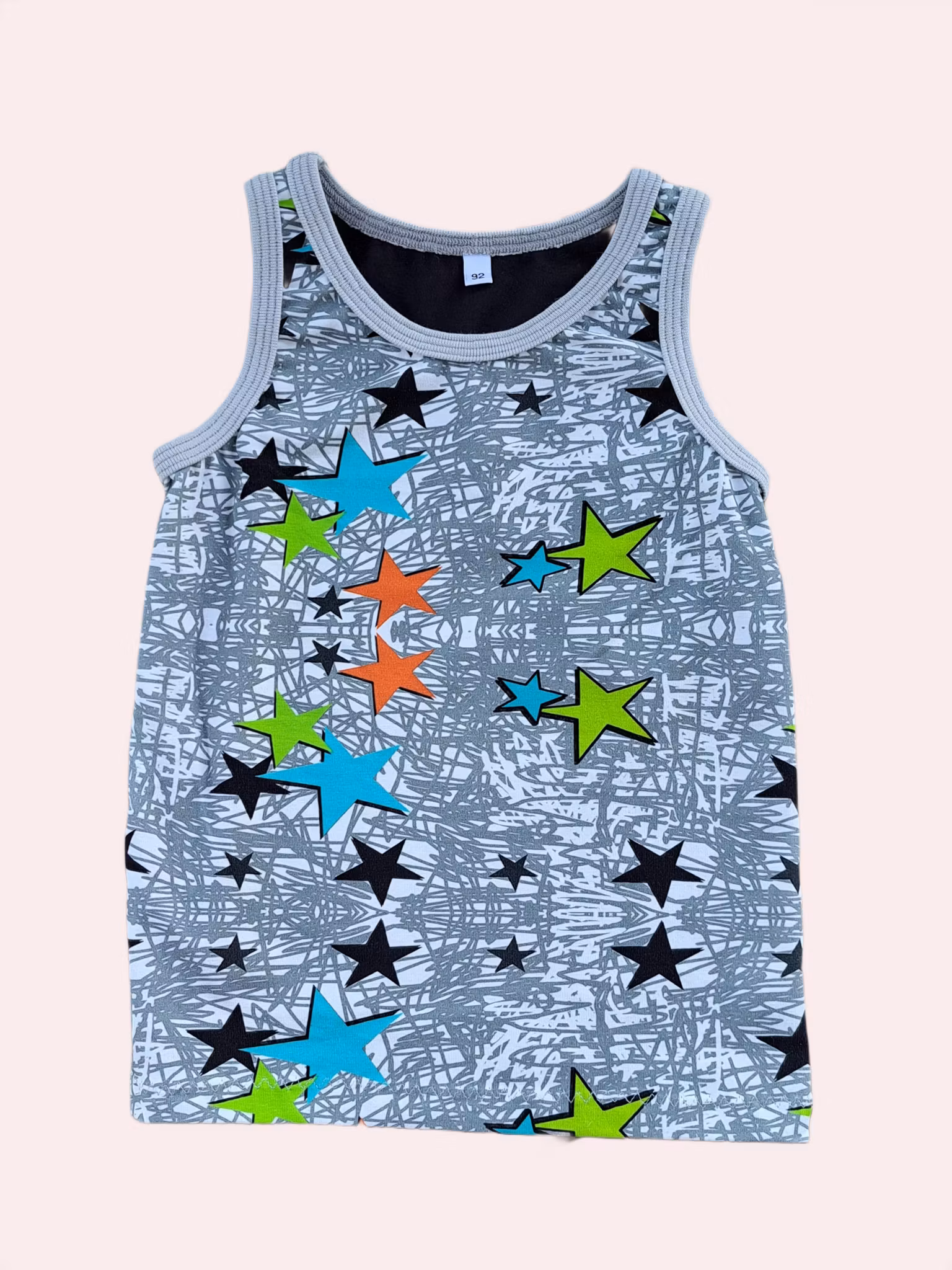 Mönster med stjärnor på grå bakgrund. Storlek 92 har svart bakstycke.