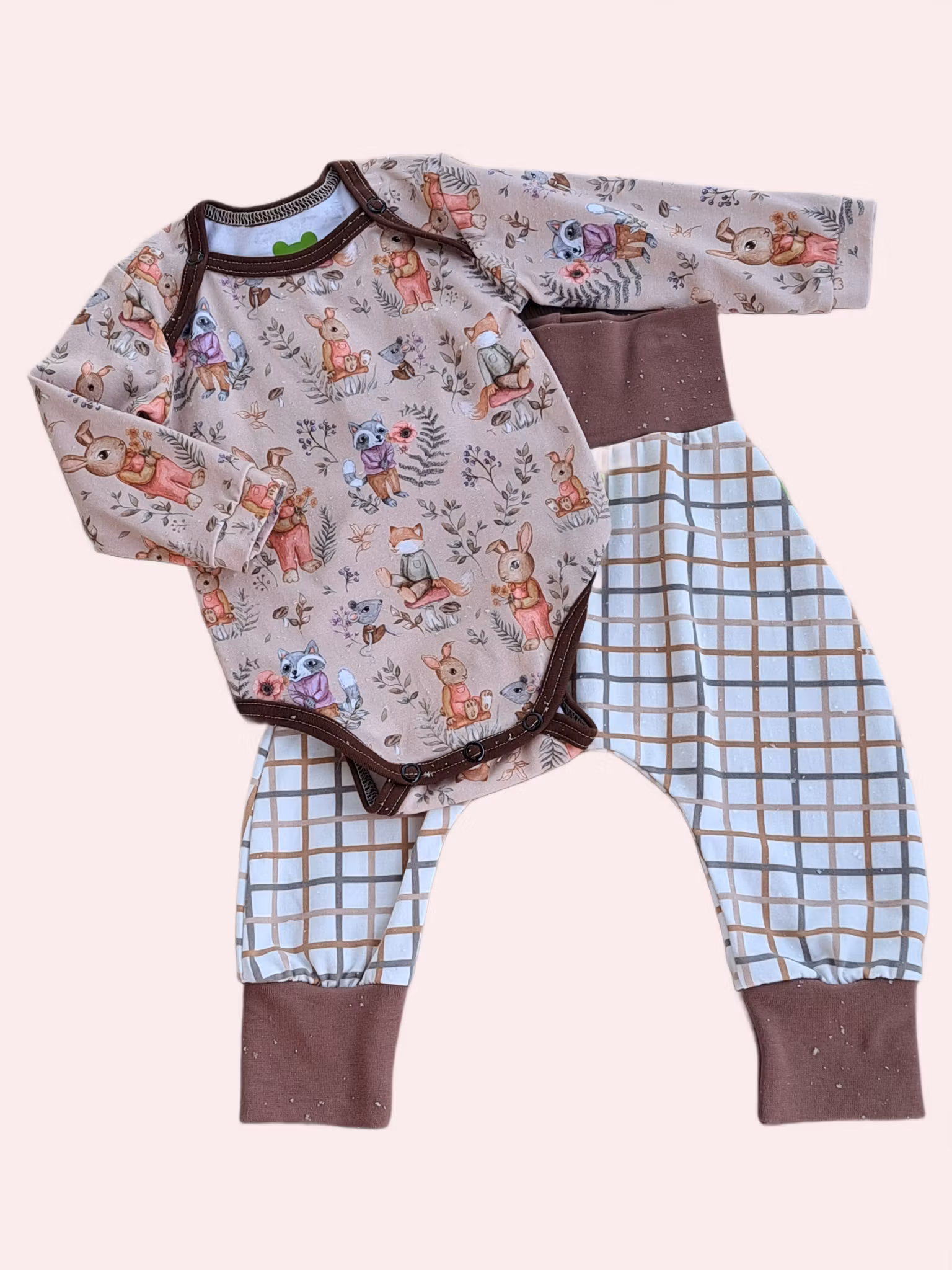 Bodyn har mönster med vilda djur på ljusbrun bakgrund och byxornaär brun- och vitrutiga.
