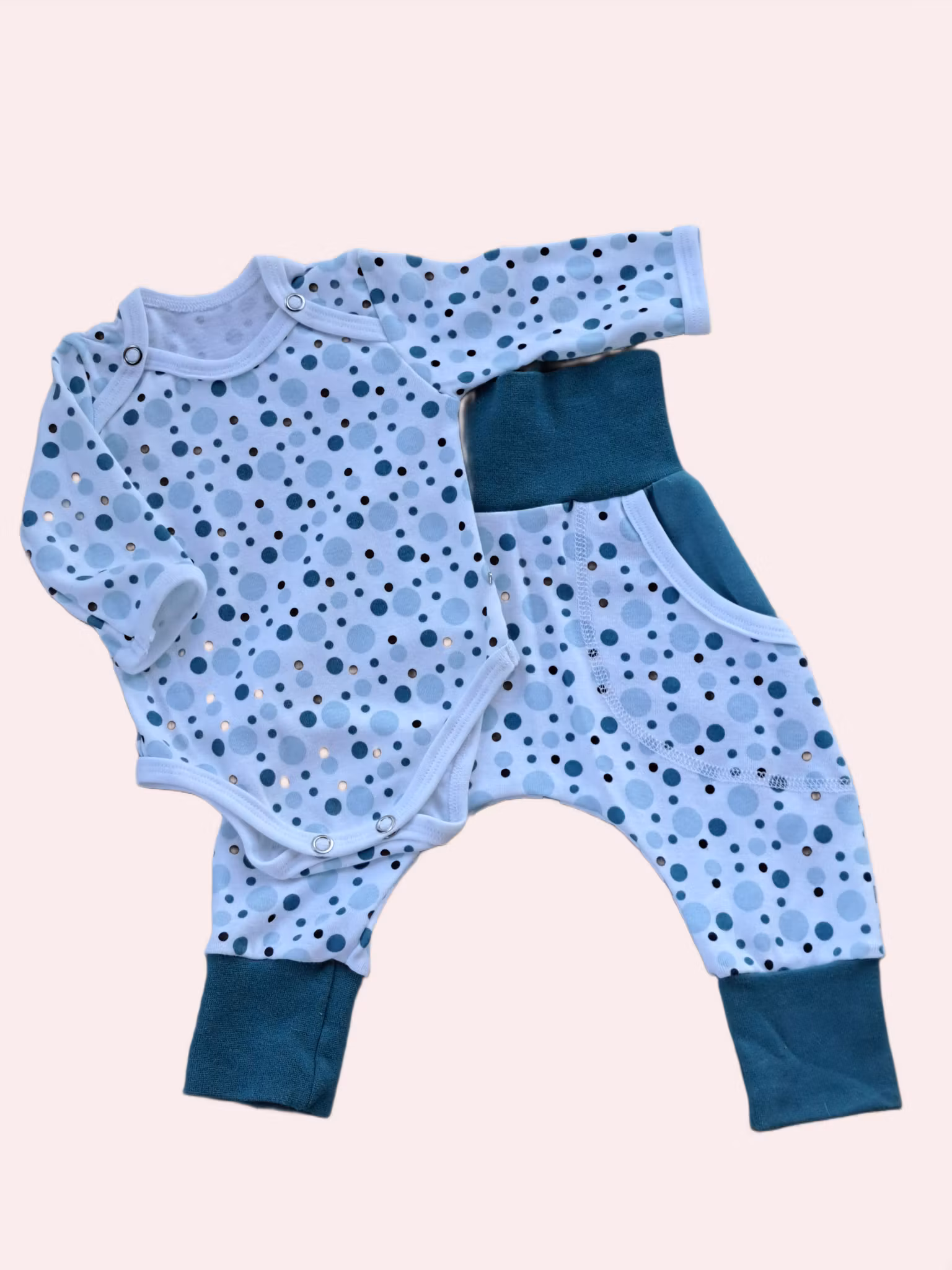Både bodyn och byxorna har mönster med blå prickar på vit bakgrund. Byxorna har fickor med blå insida.
