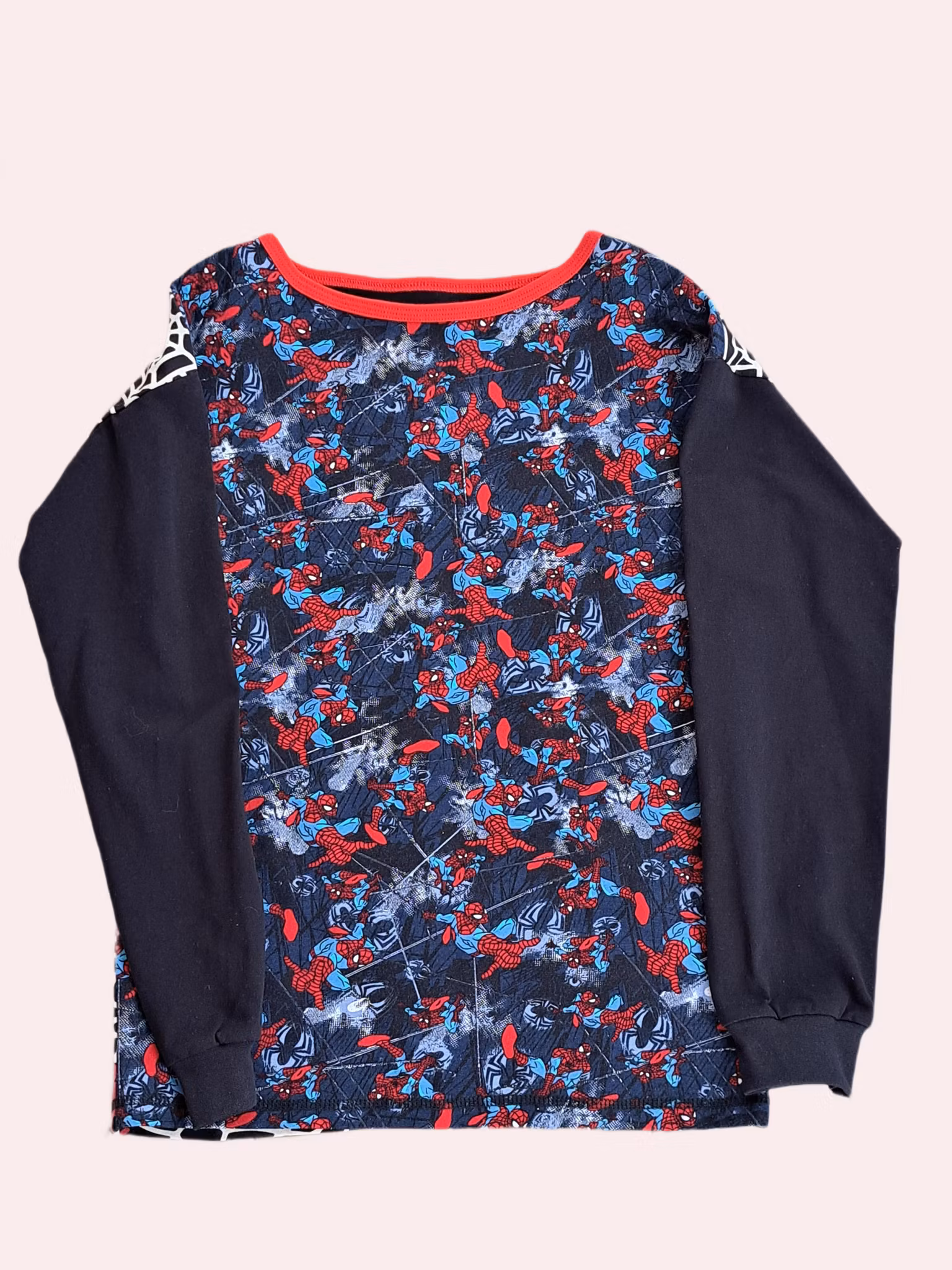 Mönster med Spindelmannen. Svarta ärmar och med en baksida med spindelvävsmönster.