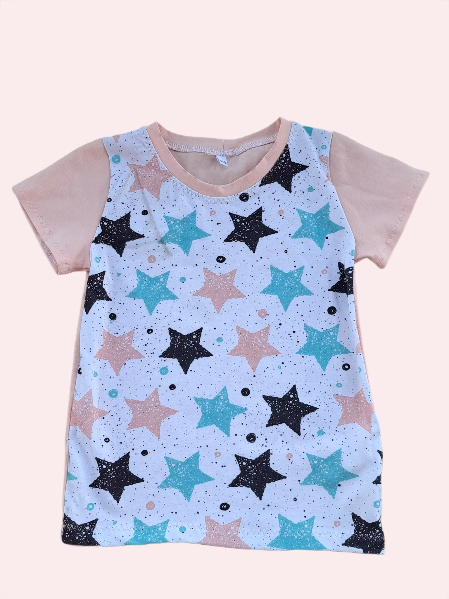 Mönster medstjärnor på vit botten. Rosa ärmar och baksida.